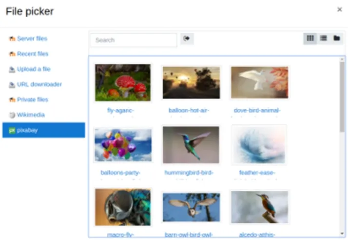 אפשרות לבצע חיפוש מילות מפתח בתוך Pixabay ישירות מממשק Moodle.